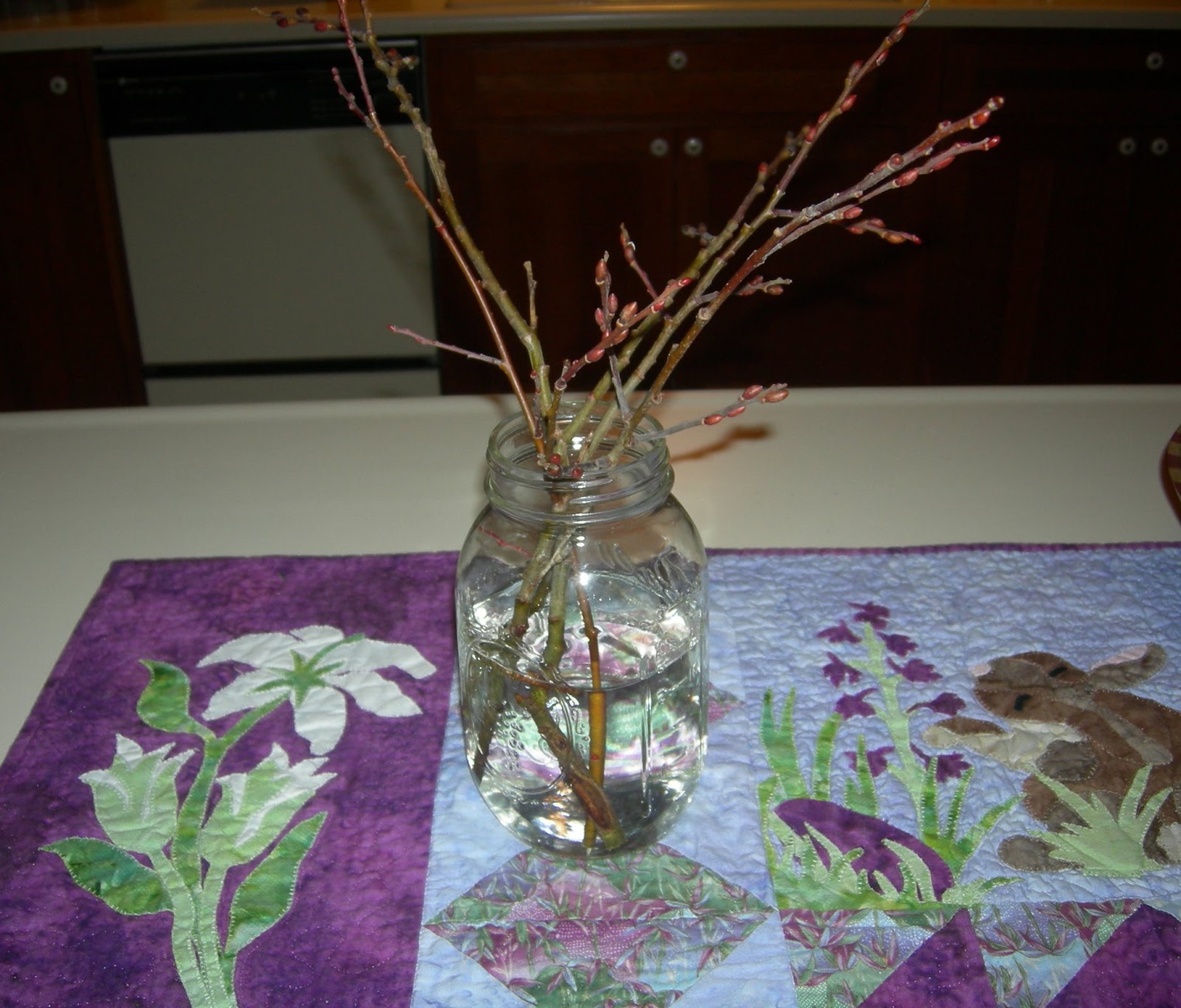 I took a nap! I do not sleep well at night, so am always tired and out of energy. So, I took a nap, then loaded a small table runner of Kris' on the longarm and quilted it, and then checked my to-do list and the last thing on it for today: Cut Pussy Willows branches. So I trekked out in knee high drifts of snow and cut some pussy willow branches and put them in water. I hope they take root and then I'll plant another pussy willow tree in the spring. (That's where the first one came from -- Bill gave me a flower arrangement once with pussy willows in it and they took root in the water and now it's a 15-20 foot tall tree.